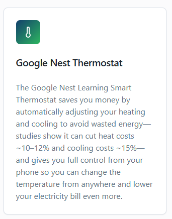 - Google Nest smart thermostat (With phone app control)